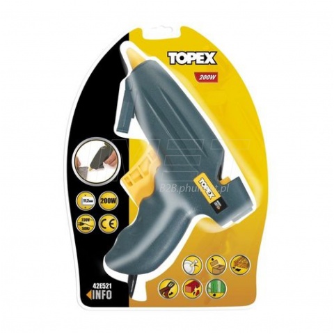 Pistolet klejowy TOPEX na klej o średnicy 11.2 mm, o mocy 200W. Poręczna obudowa i wygodny uchwyt zmniejsza wysiłek wkładany w pracę. Obudowa odporna na nagrzewanie. Końcówka do precyzyjnego nakładania kleju. Wydajność kleju 12 g/min. Idealny do warsztatu majsterkowicza, jak i do profesjonalnych zastosowań, takich jak mocowanie wykładzin, produkcja mebli. Zgodność z europejskimi standardami bezpieczeństwa zapewnia certyfikat CE. Marka TOPEX skierowana jest do majsterkowiczów.
