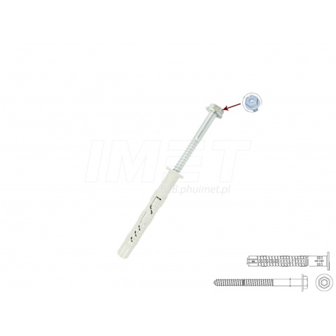| Kołek rozporowy z wkrętem z łbem stożkowym i gniazdem Pz firmy Wkręt-met. Zalecany do mocowania elementów drewnianych i lekkich budowlanych typu uchwyty pod koryta kablowe, uchwyty montażowe, drobne elementy wykończenia wnętrz. Listwy i wypustki klinują koszulkę w otworze, co zapobiega jej obrotowi podczas wkręcania wkręta. Krótka strefa zakotwienia pozwala na montaż w pełnych materiałach budowlanych. Mmontaż wkręcany pozwala na odpowiednie dociągnięcie wkręta na żądaną głębokość Wkręty można wykorzystywać powtórnie z koszulkami KPX lub KNX |