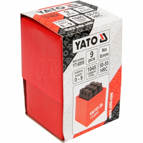Znaczniki cyfrowe Yato YT-6855 o wysokości cyfry 8 mm od 1 do 9 ze stali węglowej 1045CS, utwardzonej do 50-55 HRC. W celu uzyskania cyfry 9 należy odwrotnie odpić cyfrę 6. Komplet numeratorów przeznaczonych do trwałego, mechanicznego znakowania elementów metalowych lub niektórych tworzyw sztucznych.