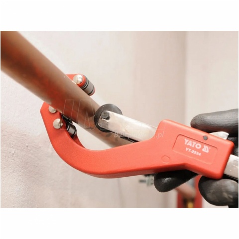 Obcinak do rur YATO YT-2234 to szybkonastawne, profesjonalne narzędzie przeznaczone do precyzyjnego cięcia rur o średnicy 14 – 63 mm, wykonanych z miedzi, aluminium oraz tworzyw takich jak PVC czy PEX. Posiada lekki, wytrzymały korpus z aluminium, ostrze ze stali łożyskowej oraz cztery stalowe rolki prowadzące, które stabilizują rurę i zapewniają czysty przekrój. Mechanizm szybkiej regulacji pozwala na błyskawiczne dostosowanie narzędzia do średnicy rury, a ergonomiczne pokrętło i przycisk szybkiego powrotu ostrza znacznie przyspieszają pracę. Dzięki solidnej konstrukcji i wygodnej obsłudze obcinak doskonale sprawdza się w instalacjach hydraulicznych, serwisowych i pracach montażowych.