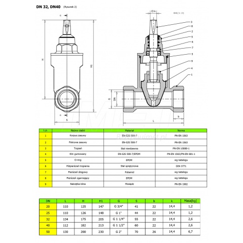 Zasuwa gwintowana DN32, wodociągowa do wody pitnej, do przyłączy