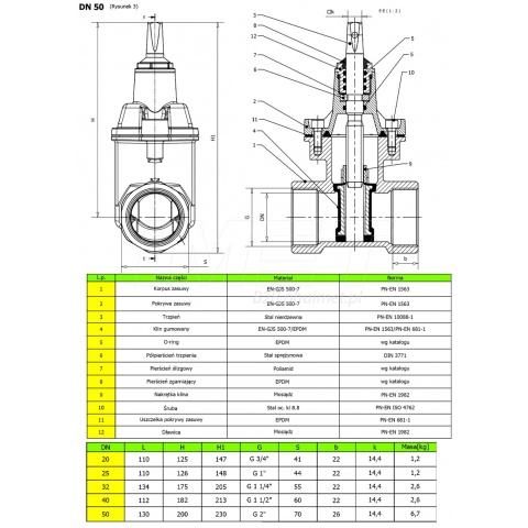 Zasuwa gwintowana średnica przyłącza: 50 (2xgwint wewnętrzny : 2")wykonana jest z żeliwa sferoidalnego(gat. EN-GJS 500-7 wg PN-EN 1563). Wykorzystuje się do odcinania i otwierania przepływu instalacji wodociągowej, do wody pitnej, ścieków sanitarnych jak i instalacji przemysłowych do temperatury od 0 do +110C. Montowana nad ziemią jak i pod ziemną .
