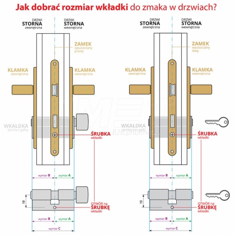 Wymiar wkładki składa się z 2 elementów składowych, np. 30/50. Oznacza to, że od czoła wkładki do środka otworu na wkręt mocujący jest 30 mm i od środka otworu na wkręt mocujący do drugiego czoła jest 50 mm. Sposób wymiarowania przedstawia rysunek obok. Ważne z tytułu bezpieczeństwa jest, aby wkładka nie wystawała poza szyld od strony zewnętrznej więcej niż 3 mm. Jeśli wkładka ma posiadać gałkę, to należy również określić, przy którym wymiarze ta gałka ma się znajdować, np. poprzez postawienie literki "G" przy danym wymiarze - wkładka G30/50 oznacza gałkę od strony 30 mm. Ogólnie przyjętą zasadą jest podawanie pierwszego wymiaru od strony gałki.