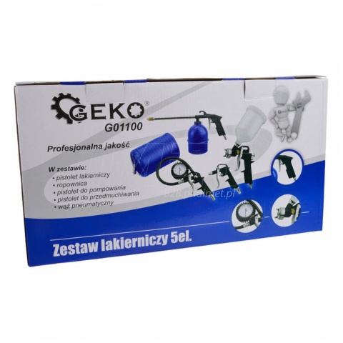 | Zestaw lakierniczy 5-częściowy GEKO G01100 to praktyczny sprzęt przeznaczony dla majsterkowiczów oraz profesjonalistów zajmujących się lakierowaniem. Produkty wchodzące w skład zestawu zostały wykonane z wysokiej jakości materiałów, co gwarantuje ich trwałość i niezawodność. Zestaw wyróżnia się także wszechstronnością – można go używać nie tylko do lakierowania, ale również do konserwacji, czyszczenia i pompowania. Narzędzia są kompatybilne z kompresorami powietrznymi, co czyni je jeszcze bardziej funkcjonalnymi. Zawartość zestawu: Pistolet lakierniczy (górny zbiornik z przykrywką i dyszą 1,5 mm) – umożliwia precyzyjne nanoszenie farb i lakierów. Posiada aluminiowy korpus i zbiornik o pojemności 600 ml, a także gwint 1/4’’ oraz mocowanie na szybkozłączkę. Wyposażony w regulację ciśnienia powietrza oraz natrysku, co pozwala na dostosowanie strumienia do rodzaju pracy. Zalecane ciśnienie pracy wynosi od 3 do 5 barów. Pistolet z dolnym zbiornikiem do ropowania (czyszczenia) – idealny do nanoszenia środków konserwujących, czyszczenia elementów mechanicznych oraz zabezpieczania antykorozyjnego. W całości wykonany z metalu i podłączany za pomocą szybkozłączki. Zalecane maksymalne ciśnienie robocze to 7 bar. Pistolet do pompowania z końcówką i manometrem – pozwala na wygodne pompowanie opon z możliwością monitorowania ciśnienia dzięki wbudowanemu manometrowi. Wyposażony jest w wąż o długości 350 mm, w zawór spustowy powietrza oraz zakończony szybkozłączami euro 1/4’’. Manometr posiada gumową obudowę, a jego skala wynosi do 15 bar lub 220 psi. Pistolet do przedmuchiwania – przydatny do usuwania zanieczyszczeń z trudno dostępnych miejsc. W całości wykonany z metalu, podłączany na szybkozłączkę. Maksymalne ciśnienie pracy wynosi 8 bar. Przewód spiralny – 5 metrów węża spiralnego wykonanego z wytrzymałego polietylenu, zapewnia elastyczność i wygodę pracy z narzędziami pneumatycznymi. Średnica wewnętrzna przewodu pneumatycznego to 6 mm, zewnętrzna 8 mm, a całość zakończona jest szybkozłączkami. Maksymalne ciśnienie robocze to 8 bar. |