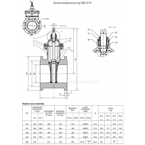 1. Korpus zasuwy z 8-otworami montażowymi 2. Pokrywa zasuwy 3. Uszczelka pokrywy 4. Trzpień Stal 5. Dławica 6. Klin gumowany 7. Nakrętka klina 8. Śruba Stal 9.Pierścień zgarniający 10.Pierścień ślizgowy 11.Pierścień uszczelniający 12.Pierścień uszczelniający 13. Półpierścień trzpienia 14.Pierścień uszczelniający