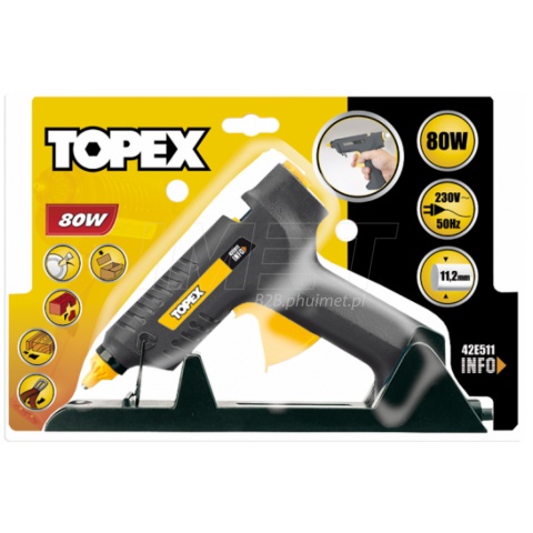 Pistolet klejowy TOPEX na klej o średnicy 11.2 mm, o mocy 80W. Pistolet bezprzewodowy umożliwia pracę w miejscach do których nie ma podejścia z kablem, np. w pracach na drabinie. Poręczna obudowa i wygodny uchwyt zmniejsza wysiłek wkładany w pracę. Obudowa odporna na nagrzewanie. Końcówka do precyzyjnego nakładania kleju. Wydajność kleju 14-16 g/min. Idealny do warsztatu majsterkowicza, jak i do profesjonalnych zastosowań, takich jak mocowanie wykładzin, produkcja mebli. Zgodność z europejskimi standardami bezpieczeństwa zapewnia certyfikat CE. Marka TOPEX skierowana jest do majsterkowiczów.