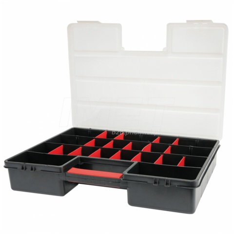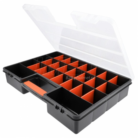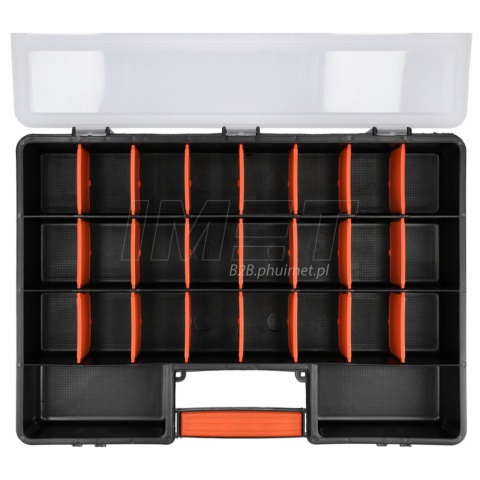 Organizer XL Premium VOREL 78819 o wymiarach 460 × 320 mm, wykonany z trwałego tworzywa PVC, to praktyczne rozwiązanie do przechowywania drobnych elementów złącznych, części zamiennych, akcesoriów i małych narzędzi. Wyposażony został w wyciągane ścianki, które umożliwiają regulację rozmiaru przegródek, dzięki czemu łatwo dopasować je do aktualnych potrzeb.