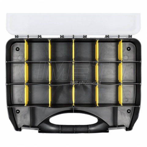 Organizer DOMINO VOREL 78794 o wymiarach 360 × 270 mm to praktyczne rozwiązanie do przechowywania drobnych przedmiotów, takich jak elementy złączne, części zamienne czy małe narzędzia. Wykonany z trwałego tworzywa PVC, posiada solidne zamknięcie oraz wygodny uchwyt do przenoszenia, co ułatwia transport i przechowywanie. Wyciągane ścianki wewnętrzne pozwalają na regulację rozmiaru przegródek, dzięki czemu organizer można dostosować do własnych potrzeb. Sprawdzi się zarówno w domu, garażu, jak i warsztacie, pomagając w utrzymaniu porządku i łatwym dostępie do małych elementów.