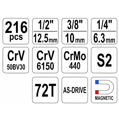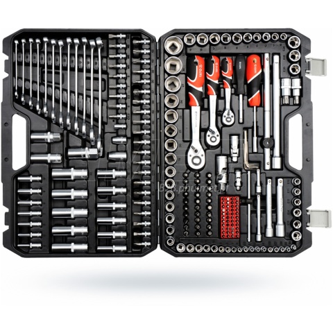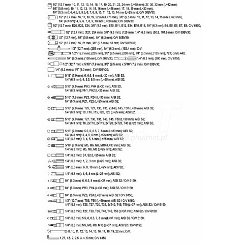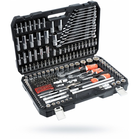 Profesjonalny zestaw narzędziowy, który został opracowany pod kątem potrzeb wyspecjalizowanych serwisów samochodowych i mechanicznych. Klucze nasadowe, jak i napęd nasadek, zostały wykonane z wytrzymałej, narzędziowej stali chromowo-wanadowej CrV 50BV3. Nasadki wykonano metodą kucia matrycowego, a przed procesem hartowania poddano je kalibracji za pomocą precyzyjnych przymiarów i urządzeń kontrolnych. Nasadki wyposażone w system AS-Drive, zwiększający maksymalny moment o 25%, przy pełnej ochronie obrzeży nakrętek, nasadki z dwutonowym wykończeniem powierzchni. W skład zestawu wchodzą również bity wykonane z twardej stali S2. Zestaw umożliwia pracę wymagającą bardzo dużych obciążeń i precyzji, pozwala wykonywać wiele czynności serwisowych związanych z odkręcaniem i przykręcaniem połączeń gwintowych o różnych rozmiarach nominalnych. Grzechotki posiadają trójkomponentową rękojeść oraz 72 zęby (skok roboczy 5 stopni).