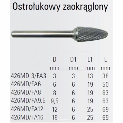 - Ostrołukowy zaokrąglony pilnik obrotowy węglikowy Beta 426MD/FA12 12 x 25 mm, trzpień 6 mm