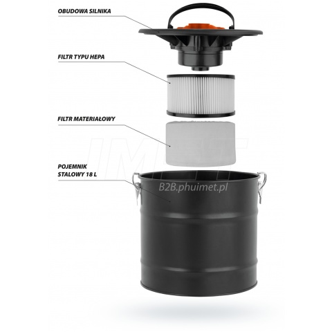 | Odkurzacz do popiołu z kominka lub grilla, posiada silnik o mocy 800W oraz podciśnienie 14kPa - metalowy czarny zbiornik o poj. 18L, - wielostopniowy system filtracji: filtr typu Hepa oraz filtr materiałowy, - żaroodporny wąż ssący o długości ok. 1m z aluminiowa końcówką 23 cm, - funkcja dmuchawy, - składany uchwyt do przenoszenia urządzenia, - kabel zasilający ok. 3 m. |