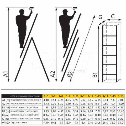 Produkt o szerokich parametrach użytkowania, sprawdzi się jako drabina przystawna, rozkładana oraz rozsuwana. Świetne zestawienie jakości do ceny oraz wytrzymałości. Przeznaczona do profesjonalnej pracy przede wszystkim na dużych wysokościach. Spełnia normy bezpieczeństwa EN 131 oraz posiada certyfikat TÜV Rheinland. Cała konstrukcja opiera się na szerokich i mocnych podłużnicach, w zależności od ilości szczebli, mają one wielkość od 25 mm x 58 mm (do 11 szczebli) oraz 30 mm x 75mm (do 17 szczebli). Szczeble mocowane do podłużnic w technologi tłoczenia na których końcach znajdują się z jednej strony stopki antypoślizgowe z tworzywa sztucznego, a na drugiej stronie solidna i szeroka belka stabilizacyjna, która zapewnia komfort i bezpieczeństwo pracy nawet na nierównym podłożu. Polski doświadczony producent sprzętu najwyższej jakości.