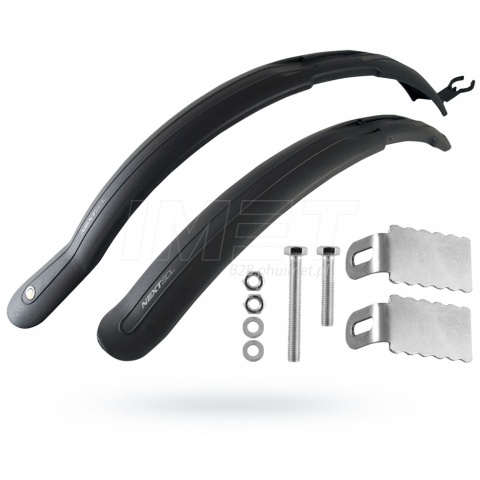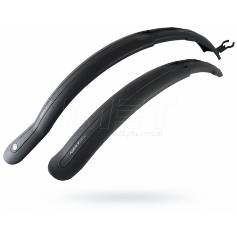 Błotniki NEXT to kontynuacja kultowych, sprawdzonych przez miliony użytkowników błotników CLASSIC SDE. Komplet ten przeznaczony jest do rowerów górskich o kołach 26 i 28 cali. Błotniki zostały przystosowane do montażu z hamulcami typu V-Brake. Stalowe, mocujące blaszki umożliwiają zarówno poziomą jak i pionową regulację. Tylny, ruchomy wysięgnik do ramy posiada zintegrowany kanał na linki przerzutek. Wersja z długim mocowaniem.