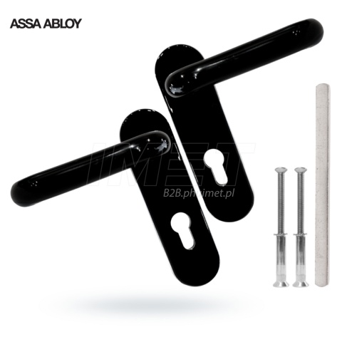 Klamka drzwiowa uniwersalna w kolorze czarnym.Produkt przeznaczony do mocowania w drzwiach przeciwpożarowych. Prezentowany model ma rozmiar 72. W zestawie znajdują się dwie klamki z podłużnymi metalowymi szyldami z plastikowymi nakładkami (maskownica).Kwadrat 9x9mm