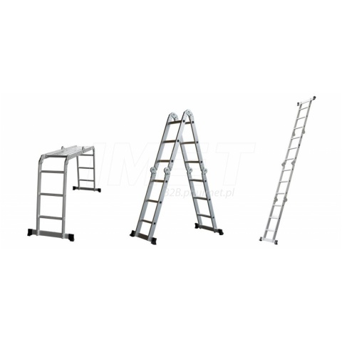 Drabina uniwersalna aluminiowa, zapewniająca komfort pracy i szerokie spektrum zastosowań. Największą jej zaletą jest lekka, zwarta i szybka w rozkładaniu oraz składaniu konstrukcja. Całość zabezpieczają dwie szerokie poprzeczki stabilizujące, a w wersji 4x3, dodatkowy podest roboczy. Jedno narzędzie pracy i tak wiele możliwości! Układ w zależności od potrzeb, zabezpieczają niezawodne, samoblokujące się zawiasy, które pozwalają na niezakłóconą pracę w każdej konfiguracji. Drabina posiada antypoślizgowe, ryflowane szczeble, które podnoszą stabilność drabiny podczas użytkowania. Maksymalne obciążenie do 150 kilogramów. Sprawdzona przez tysiące profesjonalistów w Polsce oraz za granicą. Pozwoli cieszyć się niezmienna jakością pracy na lata. Jej bezpieczeństwo oraz wytrzymałość potwierdza spełniona norma EN 131. Posiada aż 4 różne warianty ułożenia.