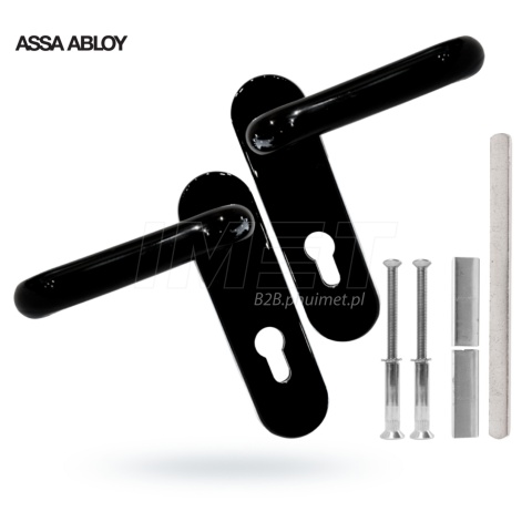 Klamka drzwiowa uniwersalna w kolorze czarnym.Produkt przeciwpożarowy, przeznaczony do mocowania w drzwiach. Prezentowany model ma rozmiar 72. W zestawie znajdują się dwie klamki z podłużnym szyldem.