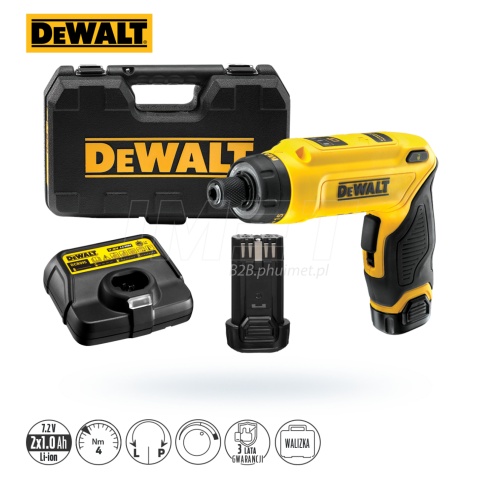 Zestaw wkrętak akumulatorowy 7,2V DEWALT DCF680G2F 2 akumulatory 1Ah Ładowarka Walizka transportowa Karta gwarancyjna Dowód zakupu