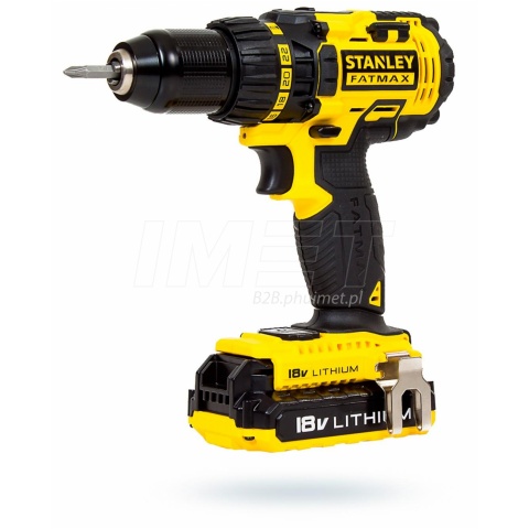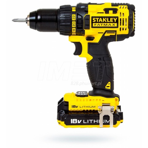 Wiertarko-wkrętarka akumulatorowa 18V Stanley Fatmax FMC600D2 Akumulator litowo-jonowy 18V Li-Ion FMC687L Walizka transportowa Zaczep do paska Bit Karta gwarancyjna Dowód zakupu