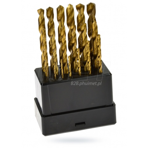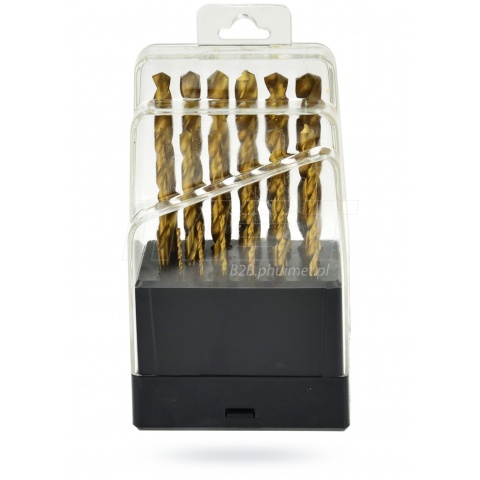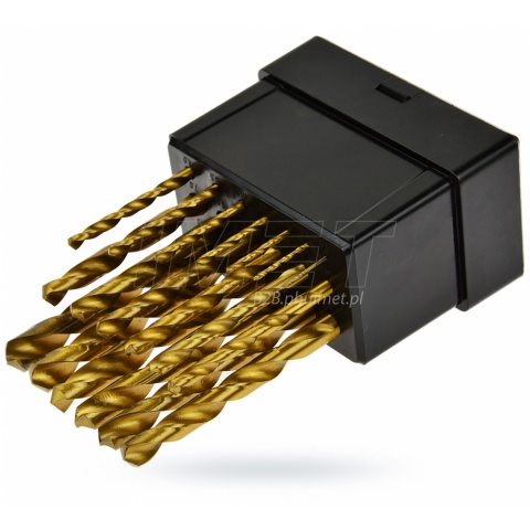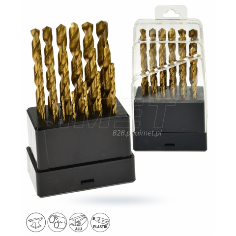 + Zestaw wierteł tytanowych 19 sztuk Komplet wierteł tytanowych, przeznaczonych do wykonywania szybkich i precyzyjnych otworów w metalu. Wykonane zostały z wysokiej jakości stali szybkotnącej HSS, a całość znajduje się w praktycznym metalowym pudełku. - Materiał: HSS