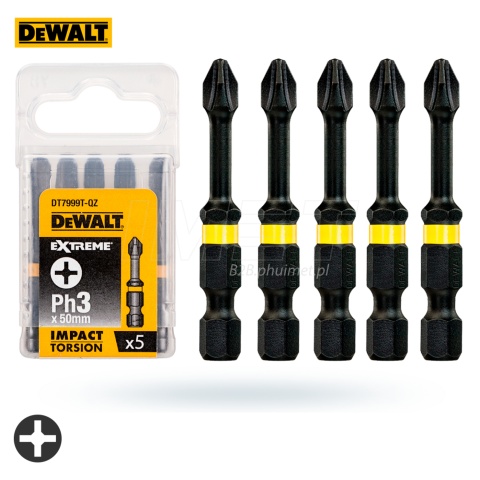 Mocne bity udarowe, końcówka wkrętarska Ph 3 x 50mm DeWalt Extreme Impact Torsion zestaw 5 szt. DT7999T