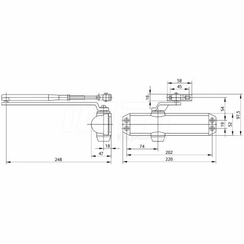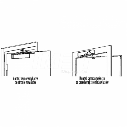 | Sposób montażu: | Montaż siłownika na skrzydle po stronie zawiasów lub na ościeznicy po stronie przeciwzawiasowej |