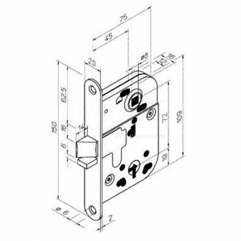 Jest to zamek wpuszczany, co oznacza, że jest montowany wewnątrz skrzydła drzwiowego, co zapewnia estetyczny wygląd oraz zwiększa bezpieczeństwo. Rozstaw zamka wynosi 72 mm, co jest standardowym wymiarem, pozwalającym na łatwą wymianę w przypadku modernizacji lub naprawy drzwi. Backset, czyli odległość od czoła zamka do środka otworu na wkładkę, wynosi 45 mm, co sprawia, że zamek ten jest uniwersalny i pasuje do większości standardowych drzwi wewnętrznych.