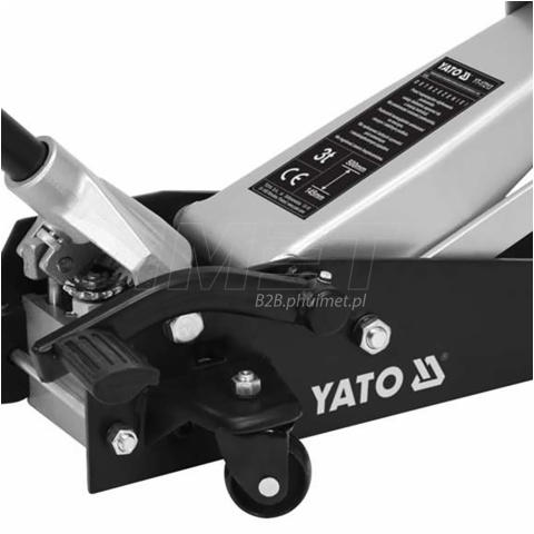 Podnośnik hydrauliczny samochodowy YATO YT-17213 to doskonałe narzędzie mechaniczne, stworzone do podnoszenia pojazdów. Jego konstrukcja oparta jest na zasadzie dźwignika ramieniowego oraz zastosowanie napędu hydraulicznego działającego w osi poziomej, zapewniając wygodę pracy. Dzięki niskiemu profilowi, jest on w stanie łatwo wsunąć się pod dowolne auto o standardowej wysokości podwozia. Ten rodzaj podnośnika, znany również jako "żaba". Wytrzymała konstrukcja pozwala na stabilne uniesienie pojazdu. Jednym z kluczowych parametrów tego modelu jest imponujący maksymalny udźwig wynoszący 3 tony (3000 kg). To oznacza, że podnośnik YATO YT-17213 jest w stanie bezproblemowo podnieść nawet cięższe samochody. Zakres podnoszenia tego podnośnika jest zróżnicowany, obejmując od 145 do 500 mm. Dzięki temu, dostosowanie się do różnych typów samochodów o różnych wysokościach nie stanowi żadnego problemu. Dźwignia szybkiego podnoszenia to kolejna cecha, która umożliwia szybkie i płynne unoszenie pojazdu do pożądanej wysokości. Dodatkowym atutem jest możliwość regulacji szybkości opuszczania przy użyciu specjalnego zaworu. To cecha, która pozwala na delikatne i kontrolowane opuszczanie pojazdu, eliminując ryzyko przypadkowego obniżenia.
