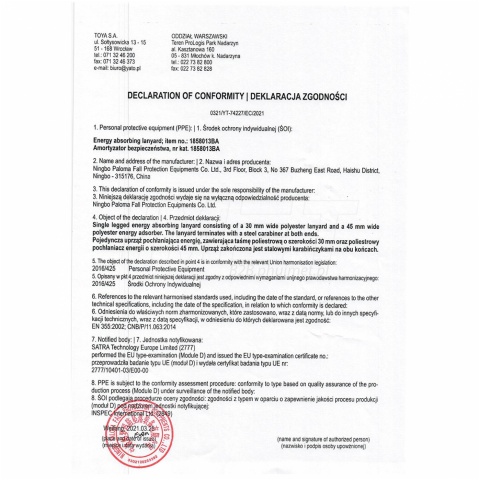 | Amortyzator bezpieczeństwa YT-74227 z taśmą oraz dwoma karabińczykami to element systemu powstrzymywania upadku, który łączy szelki bezpieczeństwa z punktem kotwiczącym. Wykonany jest z odpowiednio pozszywanej taśmy poliestrowej, której długość wynosi 1,8 metra, a szerokość taśmy to 30 mm. Jest wyposażony w dwa samo zamykane karabińczyki z ręcznym blokowaniem, o maksymalnym rozwarciu wynoszącym 16 mm. Amortyzator jest trwale połączony z taśmą. Amortyzator bezpieczeństwa YT-74227 z taśmą oraz dwoma karabińczykami został przetestowany w akredytowanym przez UE laboratorium i spełnia wymagania normy EN 355:2002. Praca na wysokości, czyli praca wykonywana na poziomie powyżej 1 metra nad poziomem ziemi/podłogi, bez pełnych ścian lub konstrukcji ochronnej do wysokości 1,5 metra, wymaga zastosowania odpowiednich środków ochrony. Gdy nie jest możliwe zastosowanie środków ochrony zbiorowej, pracodawca powinien zapewnić środki ochrony indywidualnej, takie jak ten amortyzator bezpieczeństwa. Każdy element sprzętu chroniącego przed upadkiem musi spełniać określone normy bezpieczeństwa, które są potwierdzane przez akredytowane przez UE laboratoria badawcze. Potwierdzenie spełnienia norm gwarantuje bezpieczeństwo użytkownika oraz chroni zarówno pracownika, jak i pracodawcę przed ewentualnymi karami nałożonymi przez instytucję inspekcji pracy. Wszystkie elementy sprzętu chroniącego przed upadkiem YATO, w tym ten amortyzator bezpieczeństwa, posiadają aktualne badania potwierdzające spełnienie norm bezpieczeństwa. Przestrzeganie instrukcji użytkowania gwarantuje 5 lat niezawodnej eksploatacji. Termin ważności amortyzatora bezpieczeństwa wynosi pięć lat i jest liczony od pierwszego użycia. |