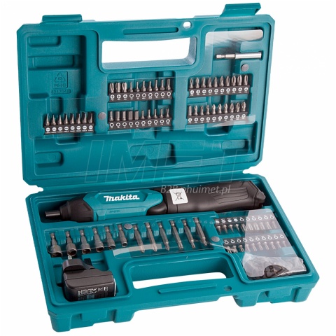 Wkrętak akumulatorowy hex 1/4" Makita DF001DW Akumulator litowo-jonowy 3.6 V/1.5 Ah Ładowarka ADP07 Kabel Micro USB -> USB Zestaw akcesoriów 81sztuk Walizka transportowa Karta gwarancyjna Dowód zakupu