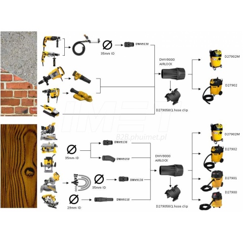 | Złącze DWV9110 ma średnicę stopniową 29-35-37 mm i można go zakładać do wszystkich urządzeń DeWalt oraz innych firm, które mają możliwość montażu adaptera.