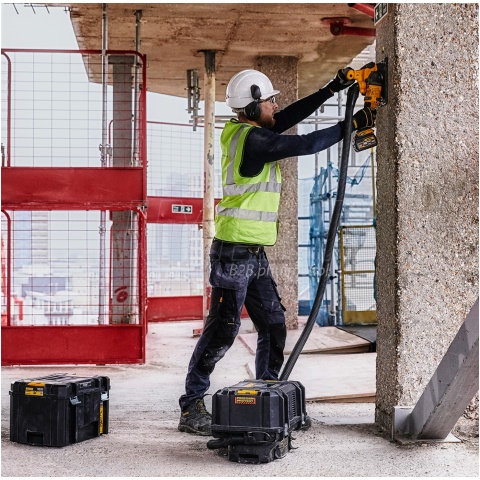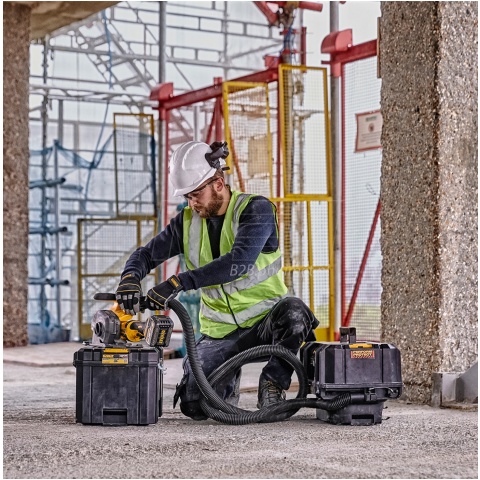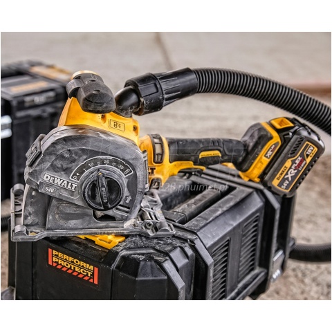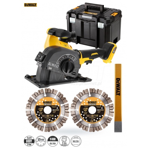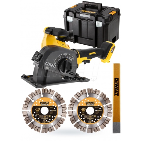 | Profesjonalna bruzdownica akumulatorowa do betonu firmy DeWALT DCG200 z mocnym i wydajnym silnikiem bezszczotkowym 54V. Urządzenie współpracuje z 2 tarczami diamentowymi 125mm. Bruzdownica do wycinania rowków pod instalacje elektryczne, wodne, grzewczej w murze, betonie, cegle oraz innych materiałach budowlanych. Ważnym atutem maszyny jest regulacja szerokości cięcia (do 35mm) regulujemy za pomocą przekładek instalowanych pomiędzy tarczami. Natomiast głębokość (do 32mm) regulujemy za pomocą pokrętła. Bruzdownica współpracuje z bezprzewodowym systemem sterowania narzędziami Wireless Tool Control i systemem odsysania pyłu Airlock Dewalt, dzięki czemu możliwa jest automatyczna aktywacja odkurzacza. Bruzdownica wyposażona jest w elektroniczny hamulec, elektroniczne sprzęgło oraz system Perform & Protect, chroniący użytkownika podczas pracy.