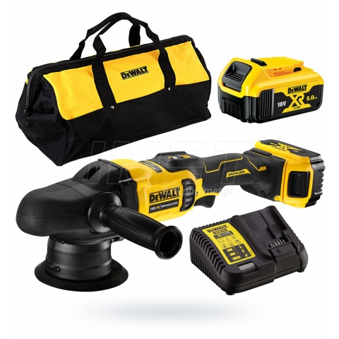 Polerka orbitalna Dewalt DCM848P2 2 akumulatory 5Ah/18V DCB184 Ładowarka wielonapięciowa 10,8-18V DCB115 Rękojeść boczna Torba transpotowa N037466 Karta gwarancyjna Dowód zakupu