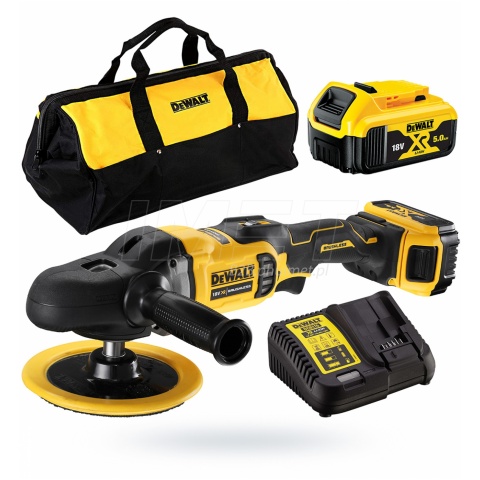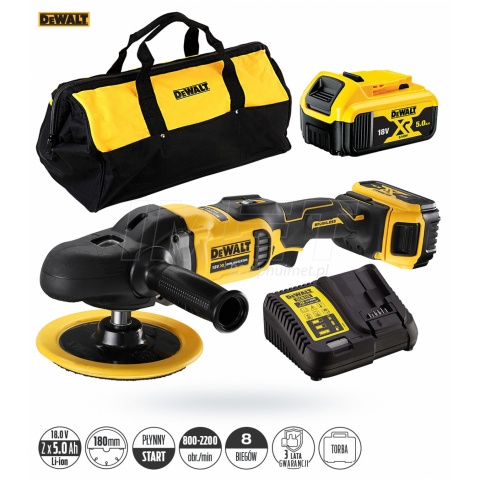 Akumulatorowa polerka rotacyjna 180mm,18V XR z dwoma akumulatorami 5Ah pakowana w torbę DeWALT DCM849P2