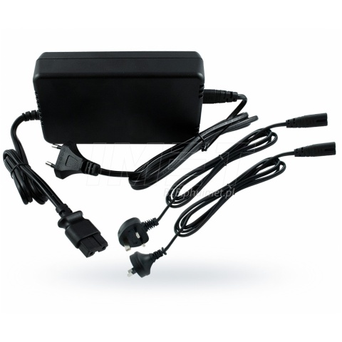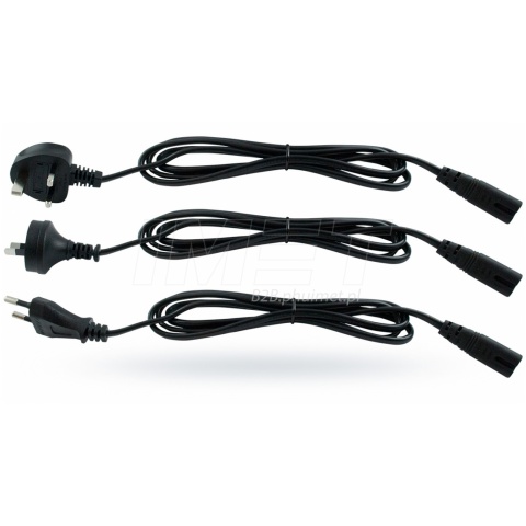 W zestawie znajdziemy zasilacz z końcówką do kompresora oraz 3 przewody zasilające z różnymi typami wtyczek europejska oraz 2 angielskie z uziemieniem i bez uziemienia.