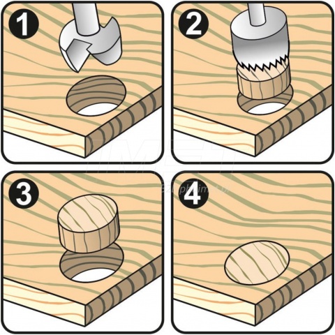 Profesjonalne wiertło przeznaczone do prac stolarskich i ciesielskich przy użyciu wiertarki stołowej lub ręcznej. Umożliwia wycinanie równych otworów w drewnie i materiałach drewnopochodnych, a także usuwanie sęków i innych defektów oraz maskowanie ich zaślepkami. Przydatne np. podczas wykonywania wpustów pod puszki zawiasów.