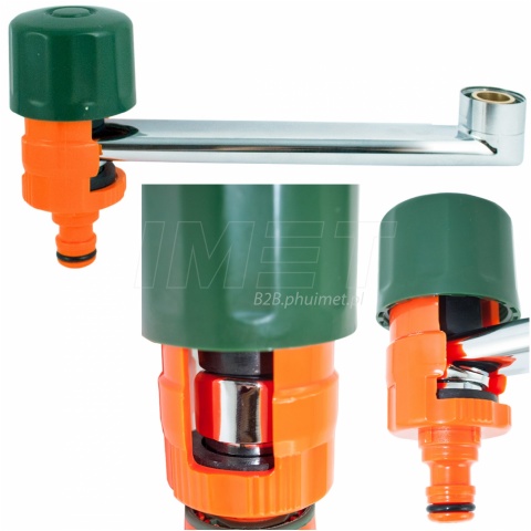 Uniwersalne przyłącze RAMP RT1127 umożliwia szybkie założenie na kran np. w kuchni, łazience itp., następnie za pomocą szybkozłączki podpiąć wąż ogrodowy.