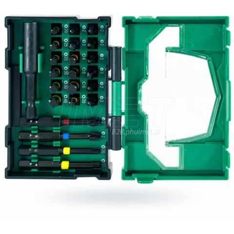 Zestaw bitów HiKOKI 40030021 przeznaczony jest dla profesjonalistów. Bity w znaczny sposób poprawiają komfort pracy i ułatwiają wykonywanie wszelkich prac związanych z wkręcaniem śrub. W prezentowanym zestawie znajduje się 18 bitów (o długości 25mm), 4 bity (o długości 50mm), adapter oraz uchwyt na bity. Bity posiadają oznaczenie kolorystyczne w zależności od rodzaju bita. Całość pakowana jest w pudełko BOX I, które pozwala na wygodne przenoszenie oraz przechowywanie oraz jest kompatybilne z różnymi opakowaniami typu BOX: BOX I, BOX II,BOX III.