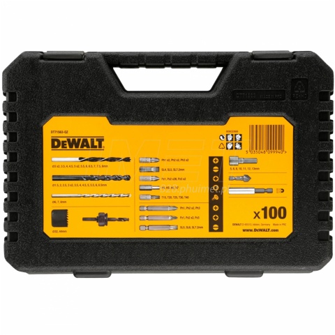 Zestaw wysokiej jakości bitów wyposażony w nasadki sześciokątne 1/4" w różnych rozmiarach, adaptera magnetycznego do końcówek 1/4” wierteł do betonu, metalu oraz drewna, otwornice oraz pogłębiacza stożkowego DeWalt DT71563. Duża różnorodność w zestawie sprawia bardzo wszechstronne zastosowanie elementów do różnego rodzaju prac. Całość zapakowana jest w walizkę wykonaną z tworzywa sztucznego, która pozwala na przechowywanie oraz transport tych narzędzi.