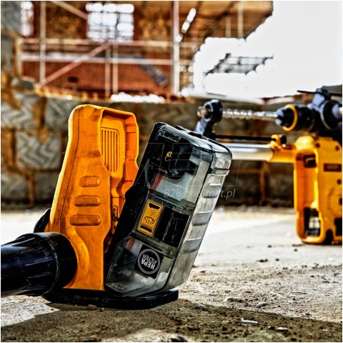 Urządzenie służy do opróżniania, czyszczenia filtrów z zestawów odpylających do młotowiertarek DeWALT za pomocą odkurzacza. Łatwe opróżnianie pełnych pojemników , wystarczy podłączyć adapter do odsysania pyłu do odkurzacza klasy M, założyć pojemnik na pył i rozpocząć odsysanie. Pełne pojemniki na pył są całkowicie opróżniane w mniej niż 30 sekund. Użytkownicy są nieustannie chronieni przed szkodliwym dla zdrowia pyłem. Mocowanie do wszystkich systemu odsysających Dewalt poprzez przyłącze AirLock. Eliminuje kurz w powietrzu podczas opróżniania pojemnika. Zestaw bez filtra.