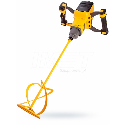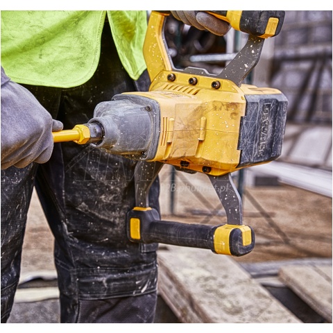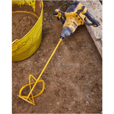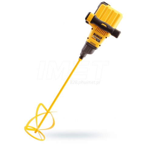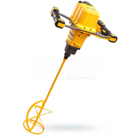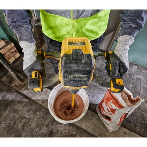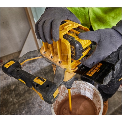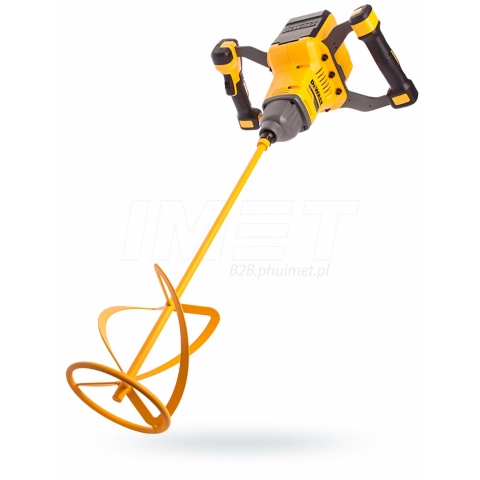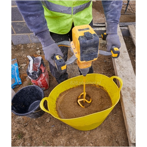 Akumulatorowa mieszarka DCD240X2 DeWALT wyposażona w silnik bezszczotkowy o mocy 2000W. Silnik jest zasilany bateriami serii FlexVolt 54V Li-Ion dzięki temu możemy mieszać nawet najgęściejsze zaprawy przy użyciu mieszadła o średnicy do 160mm. Indukcyjna technologia silnika sprawia, że jest on bardzo odporny na przeciążenia i ma wysoki moment obrotowy nawet na najniższych obrotach. Technologia brushless zwiększa możliwości eksploatacyjne narzędzia - dłuższy czas pracy na jednym naładowaniu akumulatora, mniejsze bardziej kompaktowe wymiary przy zwiększonej wydajności w porównaniu z silnikiem szczotkowym. Prędkość możemy płynnie regulować w bardzo prosty sposób za pomocą pokrętła (5-stopnowego) zainstalowanego na prawej rękojeści w zakresie 0-750 obr./min, to pozwoli nam dostosować odpowiednia prędkość do wykonywanej pracy. Wygodny chwyt dwuręczny zapewnia ergonomiczną postawę i pełną kontrolę w czasie mieszania. Klasyczne mocowanie na gwint M14 to szerokie możliwości stosowania dowolnych mieszadeł dostępnych na rynku o średnicy nie przekraczającej 160 mm.