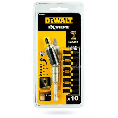10 częściowy zestaw bitów udarowych DT70518T Impact Torsion Extreme firmy DeWALT, składający się z końcówek do różnych wkrętów oraz uchwytu magnetycznego kątowego.