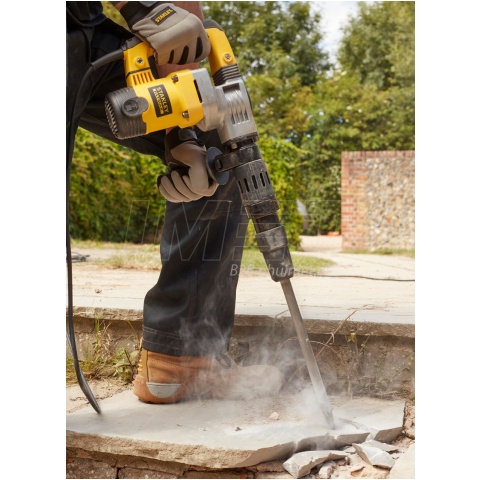 Młot wyburzeniowy SDS MAX SFMEH220 Stanley jest przeznaczony do kucia w murze, betonie i kamieniu. Silnik o mocy 1010W generuje energię udaru na poziomie 8,5J. Dla wygody użytkowania młot posiada rękojeść boczną którą możemy dowolnie ustawiać według własnych preferencji, rękojeść główna jak i boczna zostały pokryte gumą w celu zapewnienia pewnego uchwytu. System amortyzacji uchwytu skutecznie redukuje drgania powstałe podczas wykonywania prac, zwiększa to komfort użytkowania oraz ergonomie. U narzędziu zastosowano przełącznik z blokadą pracy, nie musimy trzymać cały czas włącznika, to pozwala na wygodny chwyt. Młot jest idealnie wyważony i posiada doskonały stosunek masy do osiągów 6,3kg. Producent również zadbał o łatwość wykonywania czynności serwisowych takich jak wymiana szczotek węglowych, nie musimy rozbierać całego urządzenia, wystarczy zdjąć dolna osłonę silnika aby uzyskać dostęp.