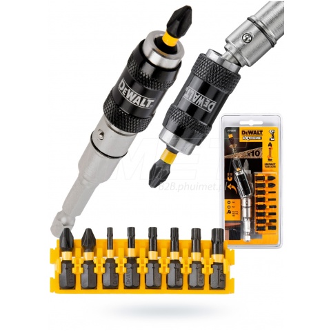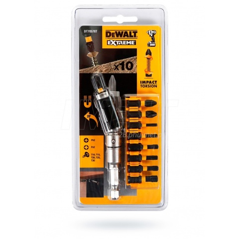 10 częściowy zestaw bitów udarowych DT70578T Impact Torsion Extreme firmy DeWALT, składający się z końcówek do różnych wkrętów oraz uchwytu magnetycznego kątowego.