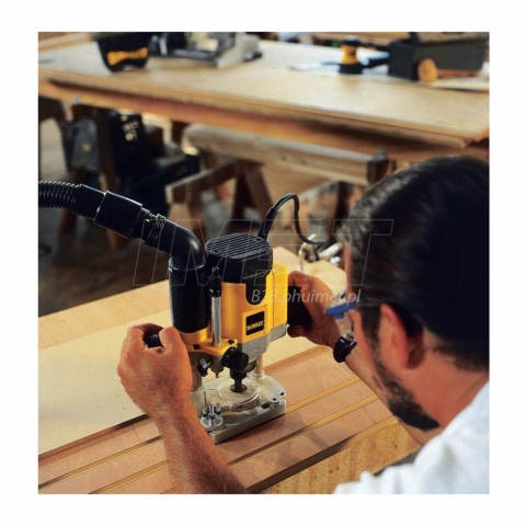 Frezarka górnowrzecionowa DeWALT DW621KT to zaawansowane narzędzie przeznaczone do precyzyjnego frezowania drewna, aluminium czy tworzyw sztucznych. Urządzenie wyposażone jest w silnik o mocy 1100 W, co zapewnia odpowiednią siłę do obróbki nawet twardszych materiałów. Regulacja prędkości obrotowej (od 8 000 do 24 000 obr./min) z podtrzymaniem mocy pozwala dostosować pracę narzędzia do rodzaju materiału i typu zadania. Frezarka posiada funkcję szybkiego ustawiania głębokości frezowania w 3 pozycjach i regulację głębokości frezowania z dokładnością do 0,1 mm, dzięki czemu otrzymasz wysoką precyzję pracy. Układ płynnego rozruchu eliminuje niebezpieczeństwo rozkalibrowania frezarki oraz minimalizuje szarpnięcia przy uruchamianiu.