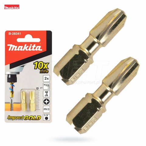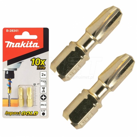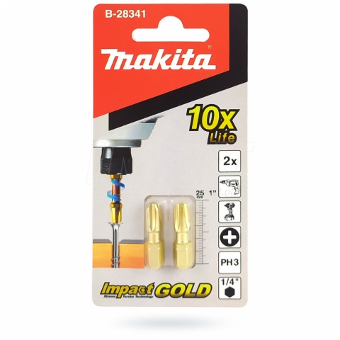 Prezentowane bity B-28341 Makita wyprodukowane są w technologii IMPACT GOLD , bity przeznaczone są do zakrętarek i kluczy udarowych, specjalna strefa skrętną zapewnia wytrzymałość na wysokim poziomie. Duża siła dokręcania potrafi spowodować uszkodzenie standardowych końcówek wkrętakowych, nowa seria bitów skrętnych marki Makita radzi sobie doskonale, wykracza ponad wszelkie oczekiwania, charakteryzując się trwałością do 10 razy większą w porównaniu do końcówek standardowych. Bity przeznaczone do długotrwałych prac wkrętarskich z zastosowaniem narzędzi udarowych (zakrętarka, klucz udarowy). Idealnie również sprawdzi się podczas pracy z wkrętami samowiercącymi oraz długimi wkrętami do drewna.