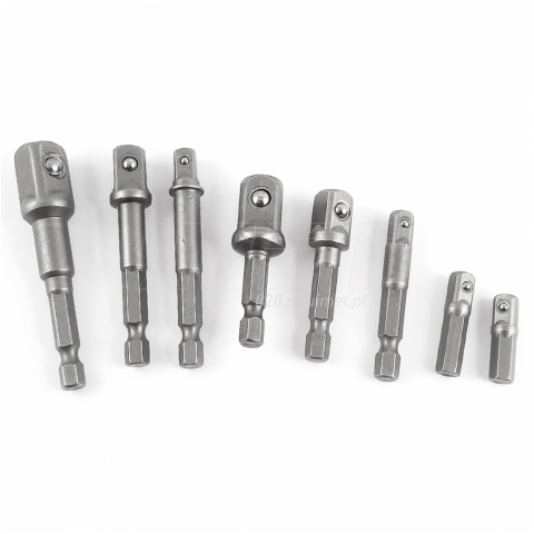 W zestawie znajduje się 8 adapterów z uchwytem sześciokątnym (hex) 1/4", które umożliwiają pracę wkrętarką / zakrętarką za pomocą nasadek z mocowaniem 1/4", 3/8" i 1/2" kwadrat. Wytrzymałość i długa żywotność dzięki wykonaniu ze stali narzędziowej.