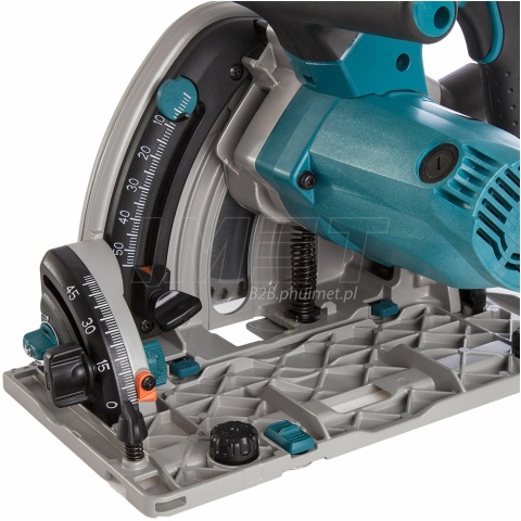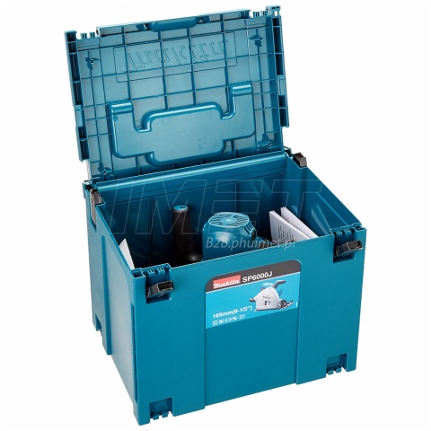 Profesjonalna pilarko zagłębiarka Makita SP6000J przeznaczona do dokładnych cięć w drewnie, drewnopochodnych oraz materiałach sztucznych. Mocy silnik o mocy 1300W, został wyposażony w elektronikę podtrzymującą stałe parametry pracy pod obciążeniem. Pilarka jest wyposażona w regulacje prędkości obrotowej w zakresie 2200-6400obr./min, pozwalając odpowiednio dobrać parametry do wykonywanej czynności. Atutem SP600J, jest beznarzędziowa regulacja głębokości i kąta cięcia. W celu zachowania bezpieczeństwa urządzenie, jest wyposażone w hamulec tarczy oraz zabezpieczenie włącznika przed przypadkowym uruchomieniem. Dla zwiększenia żywotności przekładni i silnika zagłębiarki SP600J posiada łagodny start, niwelując szarpnięcie podczas załączenia obrotów. Aby zachować czystość w miejscu pracy urządzenie posiada obrotowy wyrzutnik wiórów z możliwością podłączenia systemu odpylającego. Pilarko-zagłębiarka kompatybilna jest z szynami prowadzącymi, zapewniając precyzję wykonywanych cięć.