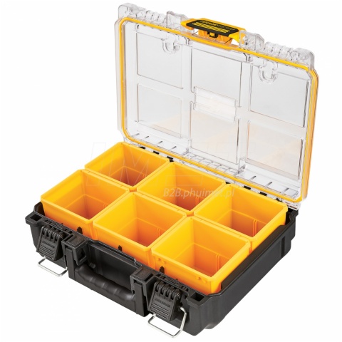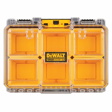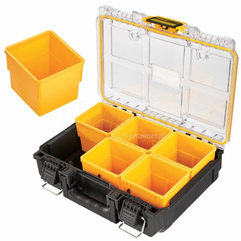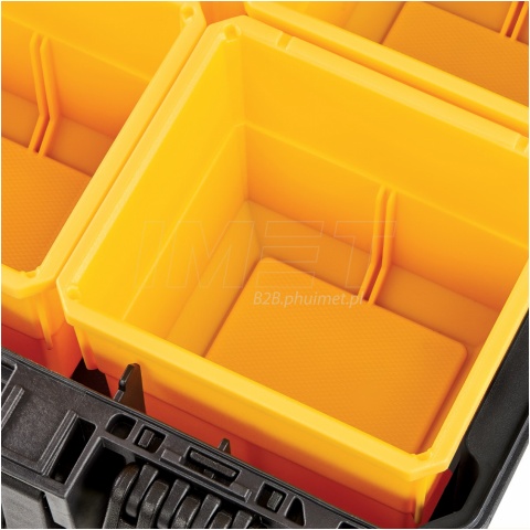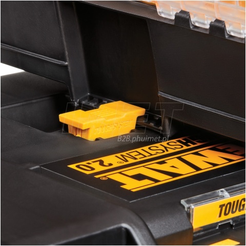 Organizer ToughSystem 2.0 DWST83392-1 DeWALT, skrzynia połówkowa , połowa standardowej szerokości skrzyni ToughSystem 2.0. Skrzynia przeznaczona na małe akcesoria, oprzęt. W wewnątrz znajdziemy 6 wyjmowanych pojemników ułatwiające organizację małych akcesoriów. Mała skrzynka jest kompatybilna z cała serią skrzyń narzędziowych ToughSystem 2.0.