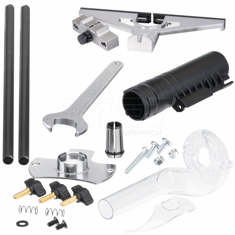 Prowadnica równoległa, system odpylający, klucz serwisowy, śruby mocujące, pierścień kopiujący