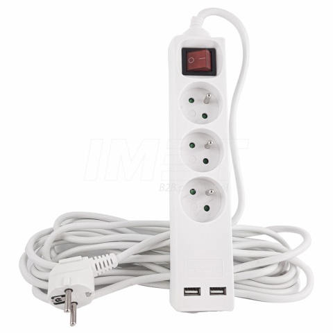 Przedłużacz elektryczny 5 m Plast-Rol W-98166 2xUSB 3-gniazda z uziemieniem i wyłącznikiem, biały